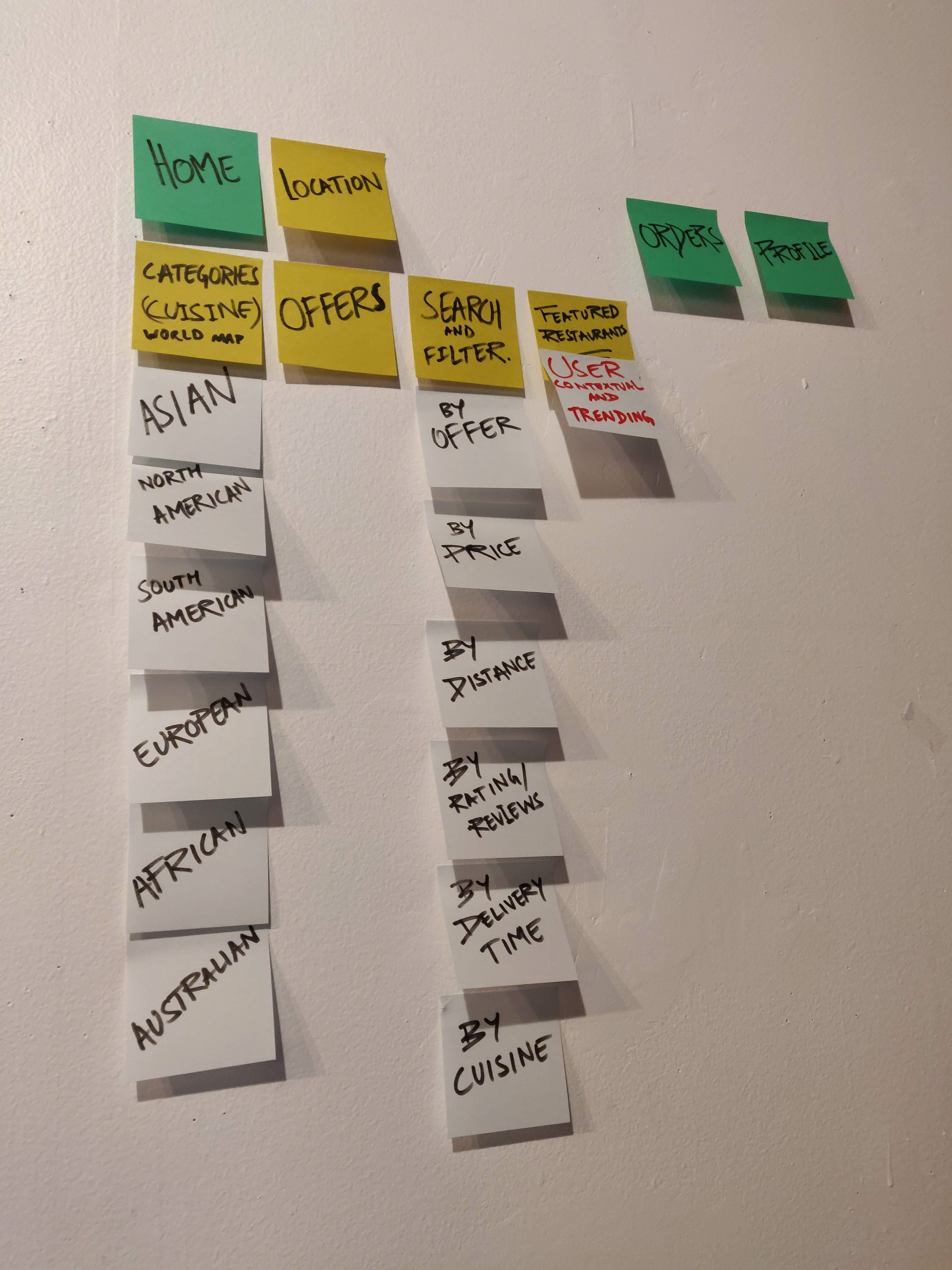 We explored different ways of finding restaurants and cuisines. We then created a site map with the exploration pages in addition to standard features expected of food delivery apps.